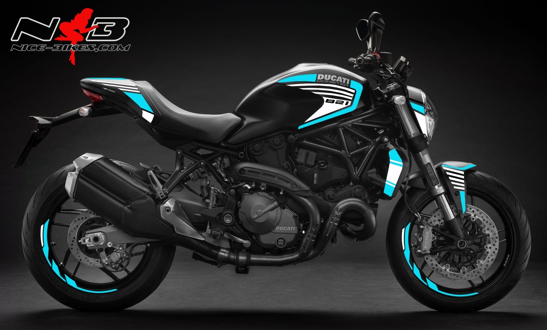 Monster 821 hellblau auf schwarzer Maschine