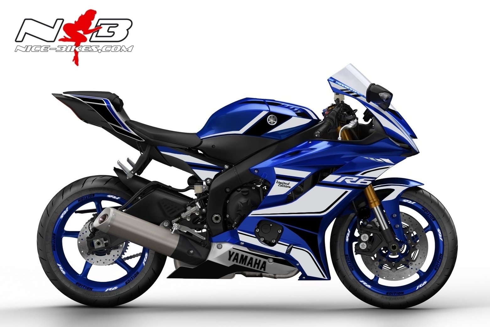 R6 Race Foliendekor weiß auf blauer Maschine